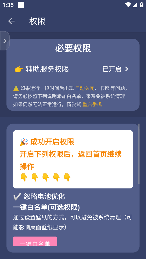 检查辅助服务是否处于开启状态(系统有可能已将其关闭)。有时候,您或许需要重新授予权限(先关闭再重新打开),或者重启设备来激活辅助服务。