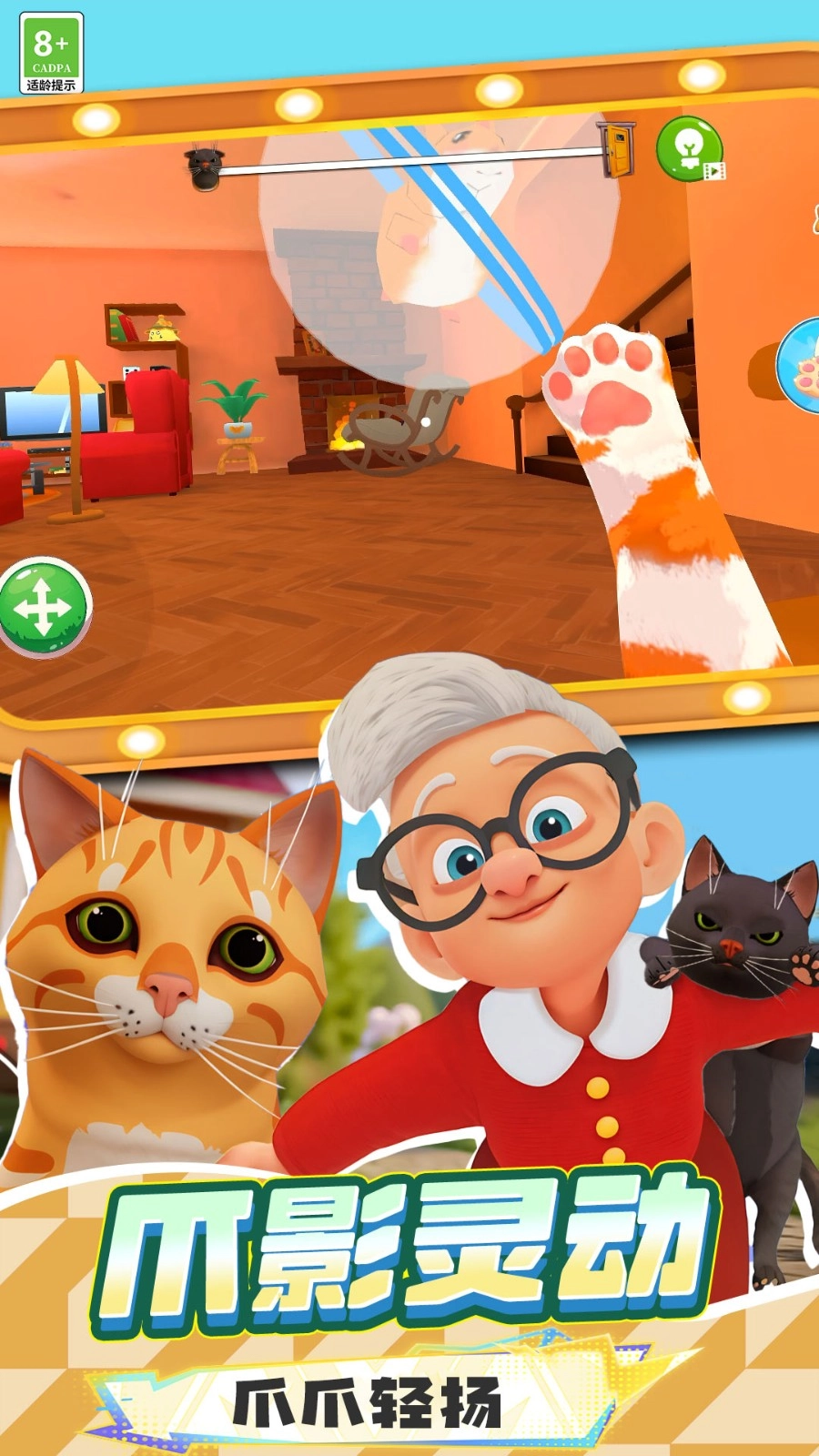 当看到黑猫出现在厨房区域时,你需要操控角色(借助左下角的方向键)朝着黑猫的方向移动,等靠近黑猫后,就能触发互动环节。