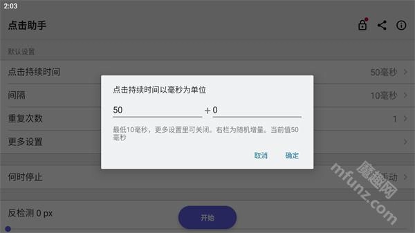 点击持续时间来调整参数,其最小值为10毫秒,右侧可设置随机增量。