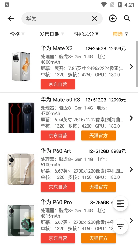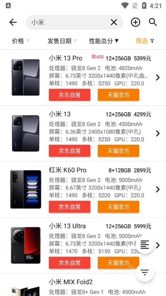 3、价格查询:支持快速查看京东自营和天猫商城的实时手机售价,助力用户轻松比价、选购心仪产品。