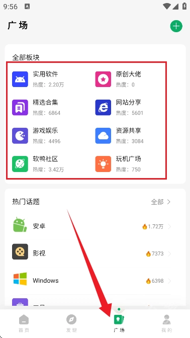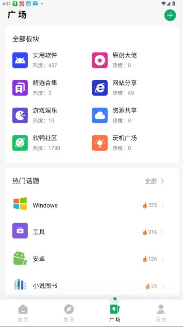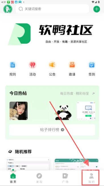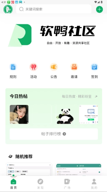 打开软鸭社区的软件首页后,你会看到多个功能入口以及今日热帖。