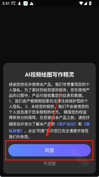 首先在魔趣网找到并安装AI视频绘图写作精灵,打开软件后点击“同意”按钮。