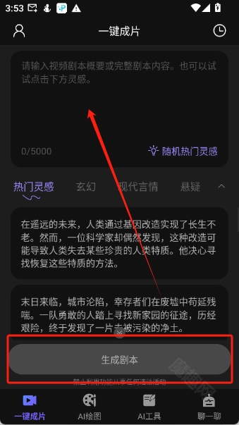 进入首页后,在编辑框里输入关键词,接着点击“生成剧本”按钮,就能快速为您创作内容。