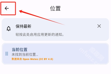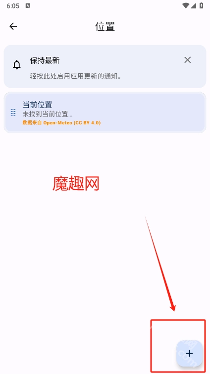 首先前往魔趣网下载并安装微风天气应用。进入应用首页后,需要先添加所在位置信息。