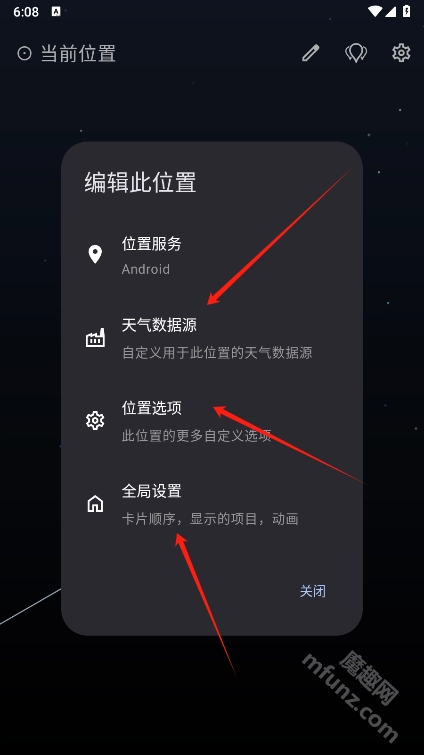 点击这个形似“笔”的图标,就能对“天气数据源”“位置选项”和“全局设置”进行自定义配置。