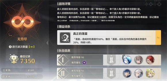 接下来是无尽模式,这个模式和第三、四关的配队思路其实差不多,但无尽模式的配队有个关键点——得选一边带一个能打协同伤害的角色,同时搭配落雷加成的buff。低配情况下渊武是必带的,尤其是在上半区,渊武的表现特别出色。如果上半用0+0的渊武搭配里哥,只要双爆属性达标,就能轻松打到四千分;要是有折枝的话,分数能突破五千;吟霖的效果介于两者之间,要是练度不够的话,可能还不如渊武好用。 这个模式对属性伤害没有限制,所以核心要求只有一个:高输出。哪个角色练度高、命座高、伤害就用哪个,完全不挑。辅助方面,如果没有高配的折枝或吟霖,带渊武就够了,绝对不会让你失望,奶妈则可以随便选。 至于无尽模式的下半区,和第三、四关的下半区玩法完全一样,没什么区别,怎么配队都行。只要把上半区打好,下半区哪怕随便混混也能拿满星声。要是想打满分数,就用忌炎、莫特、斐那这套组合;如果只是想混个一两千分,那就更简单了。
