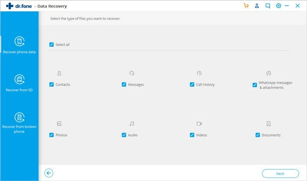 当手机连接成功后,Android版本的dr.fone会展示出所有可供恢复的支持数据类型。系统默认已勾选全部文件类型,您仅需挑选自己想要恢复的数据类型即可。