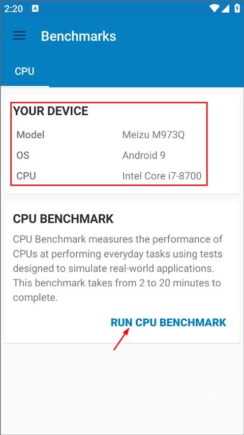 用户安装应用并进入首页后,能看到手机品牌、CPU等设备信息,点击“RUN CPU BENCHMARK”按钮即可启动性能测试流程。