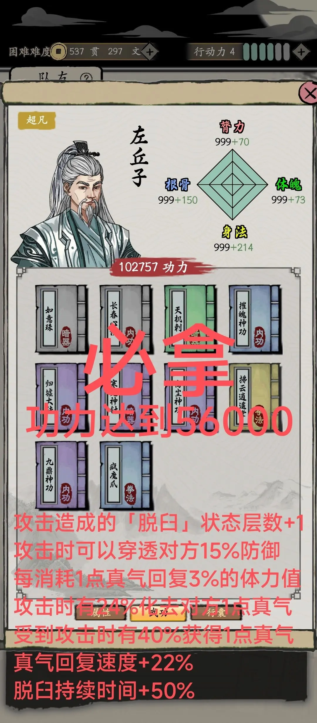 相当于没有回血能力的强化辅助版左丘子,由于获取需要75点侠义值,因此不太推荐。其强化辅助的特性源自玉衡七式,但他并非一定会施展玉衡七式,也有可能使用天罡神拳。