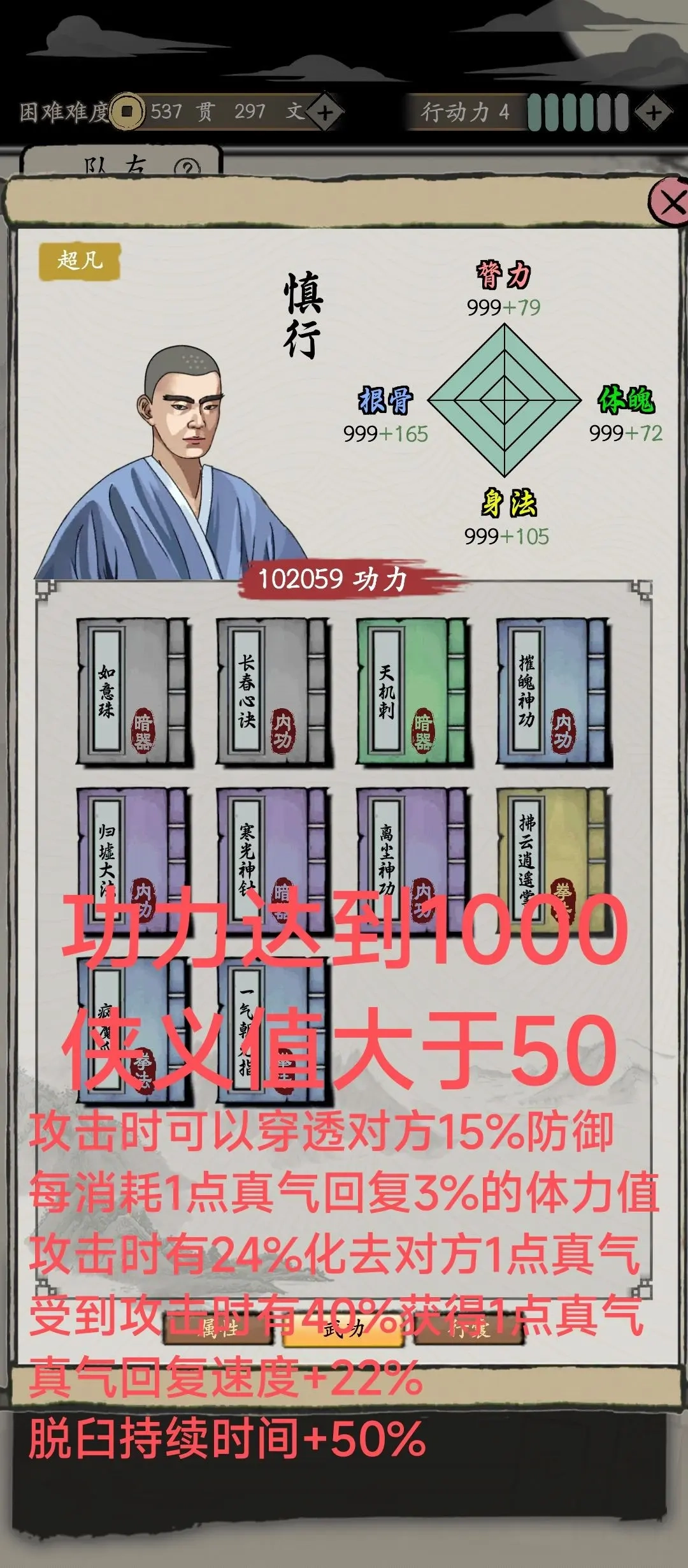 在游戏设定里,若玩家在“绝对正义”状态下进行抢劫、偷学等越界行为,会触发禁闭惩罚,通常会扣除20点侠义值与1点行动点;若想招募邪派门派的人物,可通过袭击一次野外NPC的方式,扣除20点侠义值后强行招募,不过到了下一个月,侠义值会自动恢复正常水平。