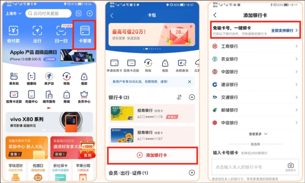 支持上百家银行,无论何时何地都能一键完成绑卡操作。绑卡流程快捷又方便,从此再也不用为出门忘带卡而烦恼了。