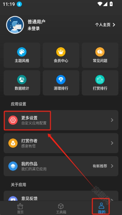 首先打开雪豹速清这款应用,接着在界面中找到并点击“我的”选项,随后进入“更多设置”页面。