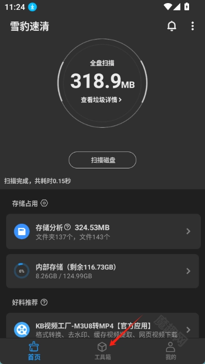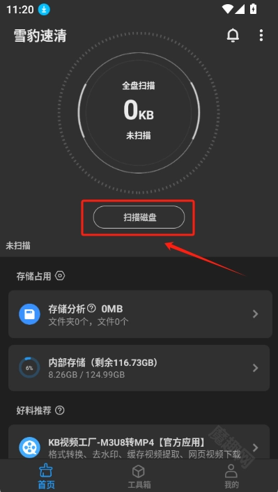 打开雪豹速清应用程序,接着点击“扫描磁盘”选项,以此来扫描手机里的垃圾文件。