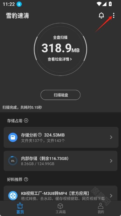 打开雪豹速清应用,接着点击右上角的三个点,这样就能展开更多选项了。