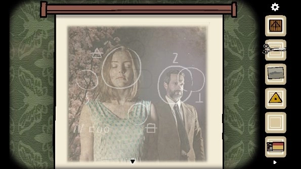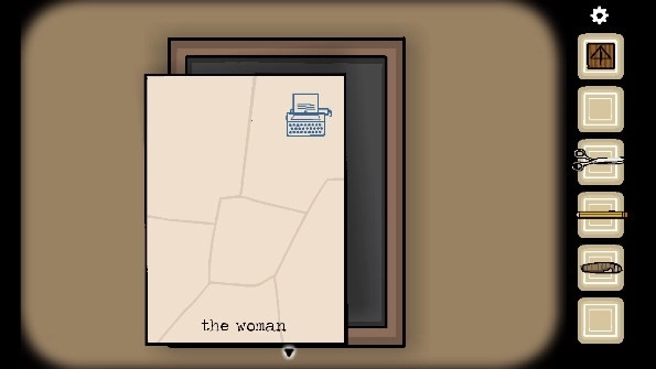 把五个碎片都放到相框上就能得到提示「the woman」(中间有一个空格),点击打字机输入这段英文后会出现一张纸,用铅笔把纸上的男人、门、女人等图案涂出来,最后涂抹钥匙图案就能获得「钥匙」。