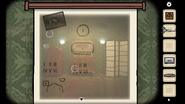 从衣架上取下那件「大衣」,接着拉开旁边的三层抽屉,取出里面的「剪刀」「照片碎片」和「铅笔」;随后打开门旁的开关,走到右侧,从灯罩里取走另一块「照片碎片」
