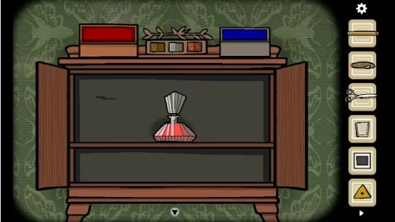 点击毛毛虫,等它吃掉叶子化成飞蛾后,飞到沙发那里,用剪刀剪开沙发拿到「线」,再拿走杯子。接着把文件柜上瓶子里的液体倒进杯子,然后将杯子里的液体倒入第一个瓶中,把线绑在这个瓶的瓶塞上,再放上钩子,就能得到「绿色眼球」了。