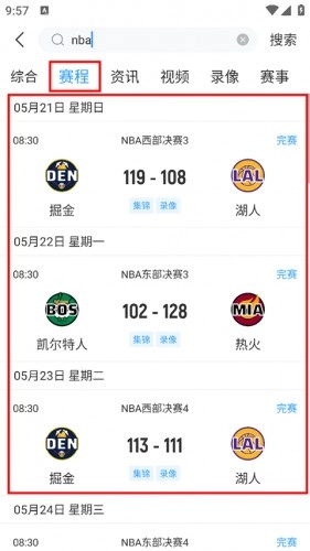 搜索后点击赛程页面,就能查看近期所有NBA比赛的赛程安排。