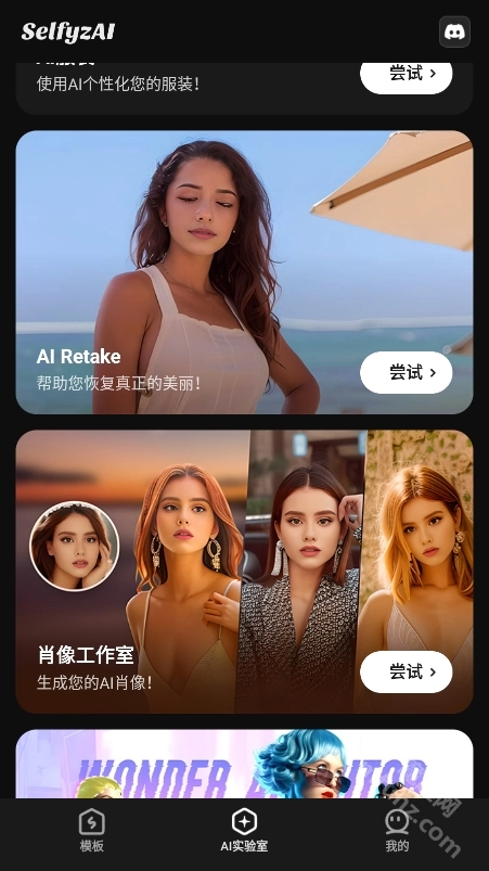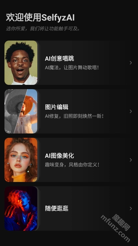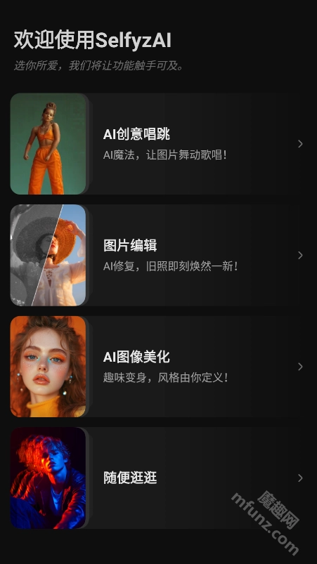 首先前往魔趣网下载并安装SelfyzAI,进入首页后,就能看到AI创意唱跳、图片编辑、AI图像美化等功能选项。