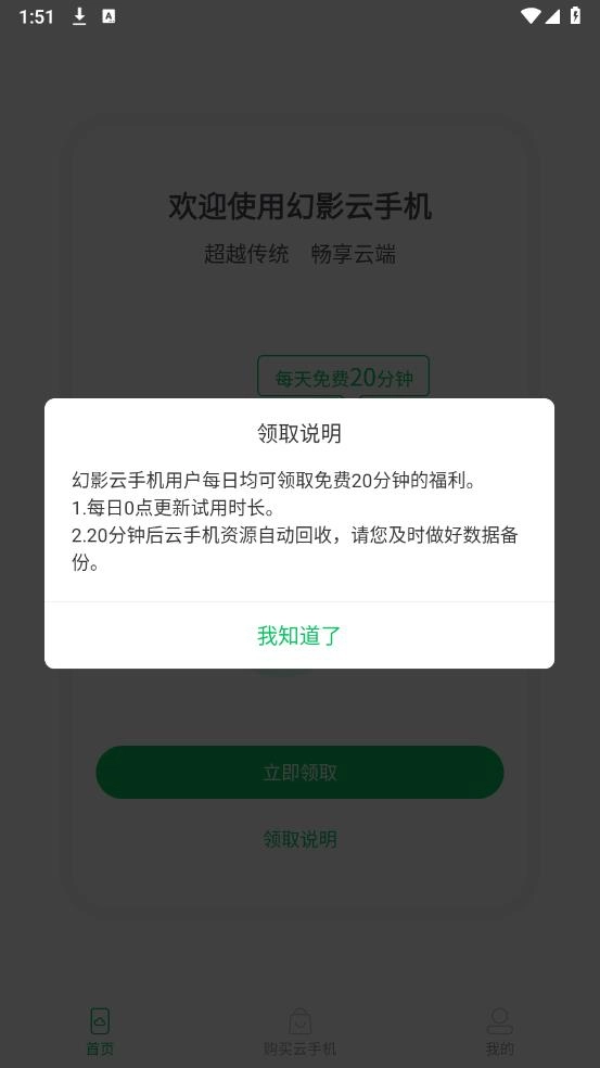 安装并打开幻影云手机,点击同意