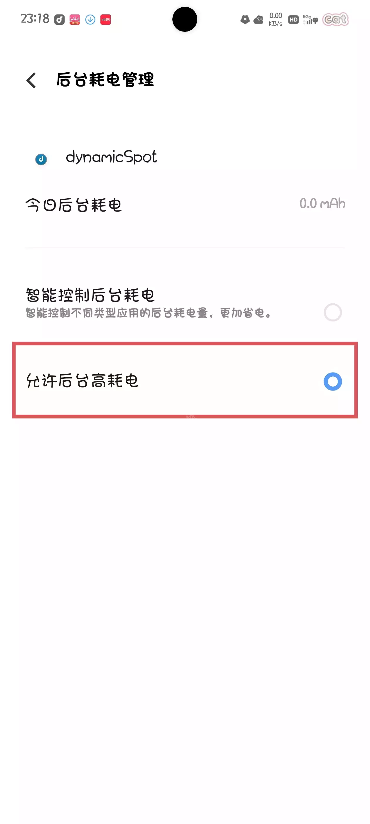 在后台耗电管理设置里,开启dynamicSpot的高耗电权限。