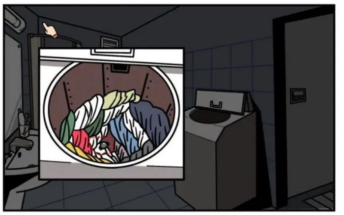 头部零件E藏于洗衣机,零件F与钱包位于拖布桶。