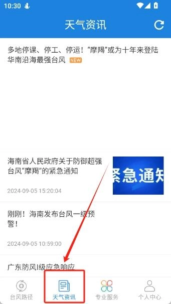 点击下方的“天气资讯”,即可获取台风相关的实时新闻资讯与通知。