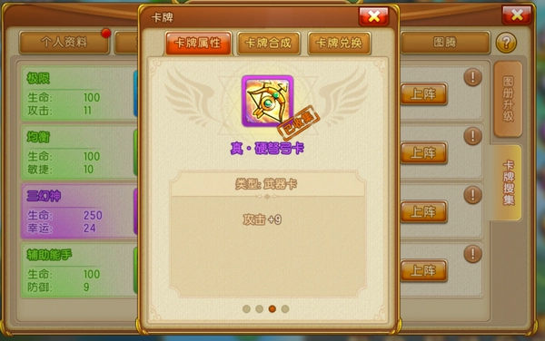 游戏里的卡牌主要有竞技卡、副本卡和秘境卡这几类,不管是哪种类型的卡牌,只要集齐一组就能马上得到该卡牌对应的属性加成,而且点亮的套卡要是上阵使用,还能在不同场景里发挥出相应的作用。