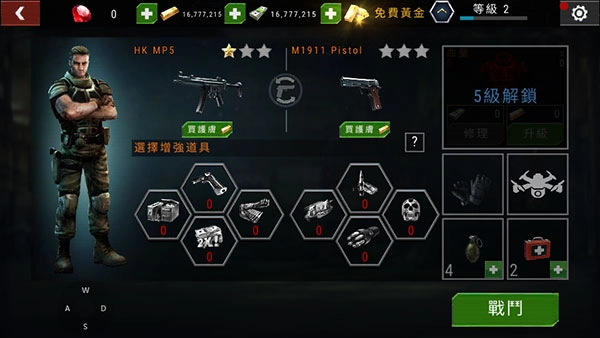 推荐的必备物品有手雷和急救包——前者能在被围困时快速清除周围敌人,后者用于恢复生命值。每日签到会赠送一定数量,建议合理使用不要随意浪费,也可以用金币购买,但非氪金玩家最好优先把金币留着买枪。