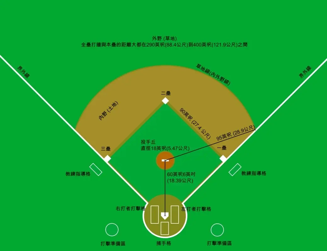 内野与外野之间设有明确界线,界线以内的区域被称作内野,一般会铺设红土;界线以外则是外野,通常覆盖着草皮。在本垒与二垒的连线上,靠近正方形中心的位置,设有一个投手丘,这里是投手投球的专属区域,而击球员会站在本垒旁边,随时准备击球。