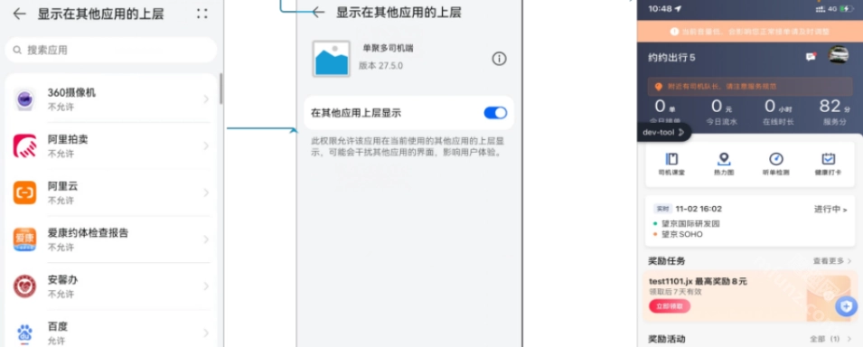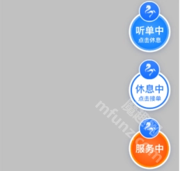 悬浮窗对应的页面:切换应用后,会显示小浮窗,浮窗有休息中、服务中、听单中这几种状态。
