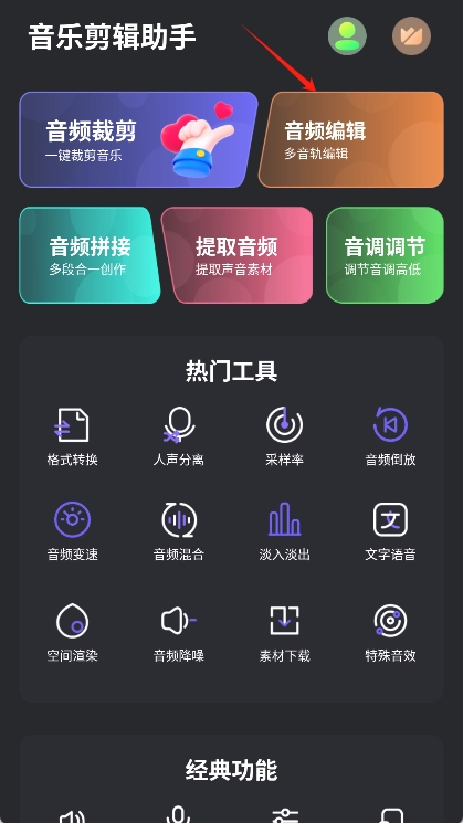 接着打开应用,在主界面里找到并选择【音频剪编辑】这个功能。