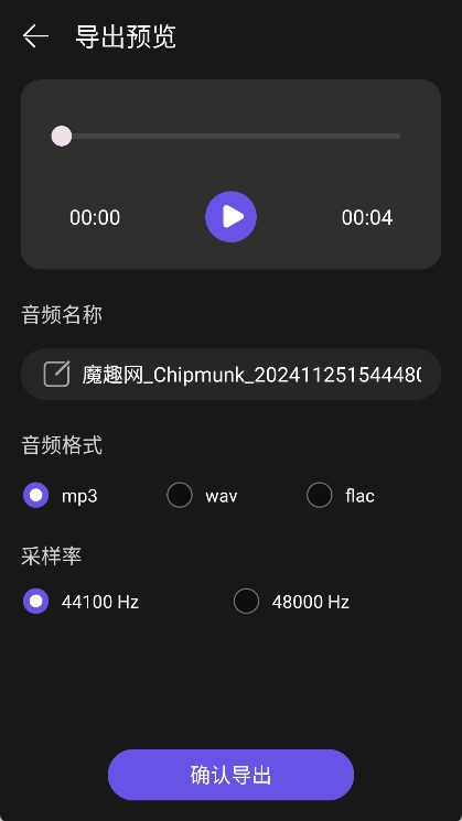最后点击【导出】按钮完成剪辑,输入名称并选择好音频格式和采样率,确认后进行保存。