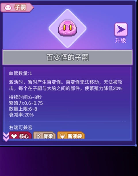 相邻的一组形式器官与功能器官会共同决定它们在游戏里的实际作用。比如小不点的初始器官“白狐的脊髓”,能以每秒1次的频率、120%的效能激活右侧器官,而“刺角蛹的触角”每次被激活时会发射1个投射物,两者结合后的效果就是每秒发射1个投射物。