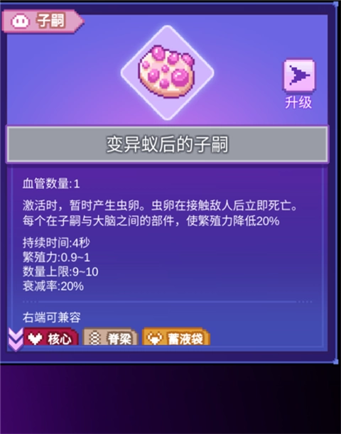 首先要说明的是,翅、腹与毒囊除了自身的固有效果外,还能充当增幅组件。若在它们的右侧相邻位置连接脊髓、肺或肠道,就能让被施加对应状态效果的单位,像子嗣那样定时触发右侧相邻的器官。这需要被施加状态效果的单位和状态效果始终保持存在。此外,肺和肠道可以在一定范围内对多个单位施加状态,这也能带来效果翻倍的作用。翅的作用对象是角色或子嗣,数量相对而言比较容易控制。这也是子嗣章节中提到的蚁后优势之一——蚁后的数量上限较高,能获得翅效果的单位自然就更多,增幅的倍率也就更高。腹和毒囊的作用对象是敌人,敌人的数量上限远比我方多,理想情况下能起到比翅更强的增幅效果;但敌人方面除了单次作用的数量难以控制外,还存在可能被状态效果本身或右侧其他器官杀死的问题,而且游戏的核心目的本就是尽快消灭敌人,因此以敌人存活为前提的增幅必然带有自限性。