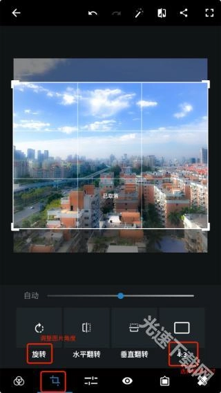 这张图片有一点点歪,在旋转里拉一点纠正过来。