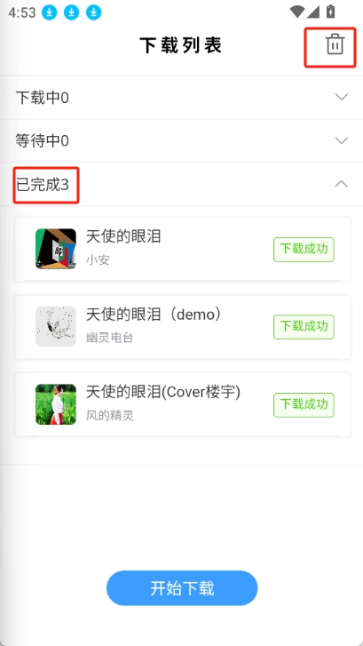 然后在列表里,点击“已完成”选项,这里就会显示你已经完成的音乐,接着点击右上角的删除按钮,就能把这个列表删掉了。