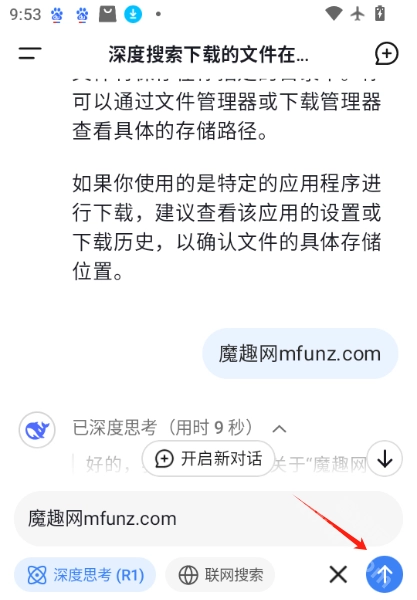 直接在深度搜索(deepseek)的输入框中输入文字,接着点击发送按钮就可以了。要记住,提问越是具体详细,得到的答案就会越精准哦。