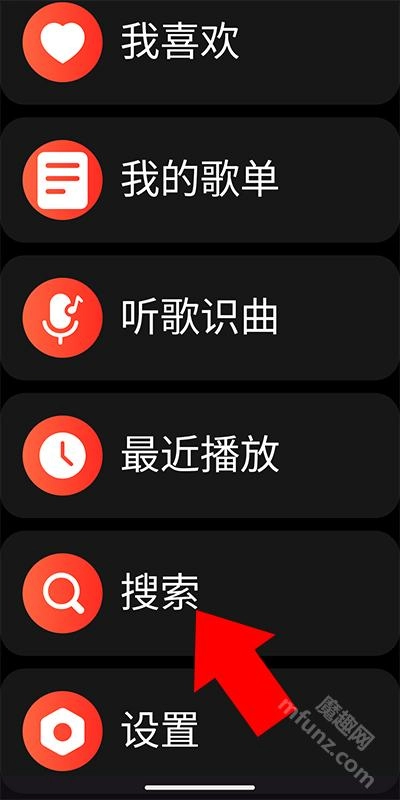 打开网易云音乐手表版应用,点击界面右上角的三条横线图标进入菜单页面,接着向下滑动页面找到搜索按钮。