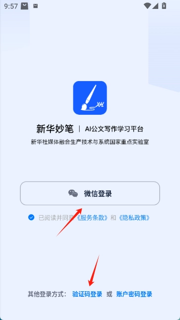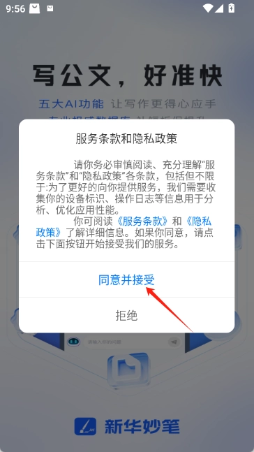 安装并打开新华妙笔。进入软件后,同意用户协议。