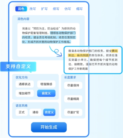 以润色功能为例:用户输入需要处理的内容后,接着选定具体的优化方向、期望的语言风格以及对文本长度的要求,系统便会据此生成润色后的内容。