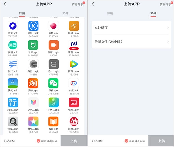 进入游戏上传功能界面后,红手指云手机会自动检测并展示手机内已有的APK文件,同时也支持上传其他格式的文件。操作时,先点击需上传的文件,勾选是否自动安装该文件,最后点击“上传”按钮即可。