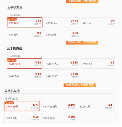 答:目前红手指提供以下套餐选项供您挑选:2元/天(该套餐为限时开放),VIP套餐包含9元/5天、38元/30天、98元/90天、168元/180天、248元/365天;GVIP套餐有58元/30天、158元/90天、268元/180天、388元/365天;KVIP套餐涵盖4元/1天、18元/5天、77元/30天、196元/90天、496元/365天;IphoneGVIP套餐则是4元/1天、18元/5天、77元/30天、196元/90天、496元/365天。