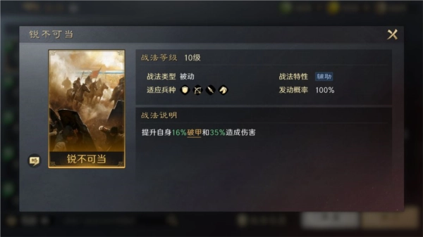 作为稳定增益型的被动辅助战法,它可以增强自身的“破甲”效果并提高造成的伤害。