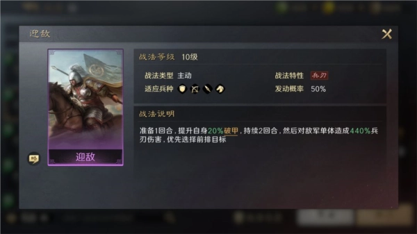 组合思路:【锐不可当】可提升“破甲”效果与伤害输出,再搭配【迎敌】能进一步强化破甲能力,以此大幅增强携带该组合武将的输出水平。