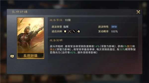 自带战法为【乱世奸雄】,这是一个指挥类战法,能够为全队提供减伤效果,同时让我军获得“倒戈”与“攻心”的战斗增益;此外,当我军统率最高的单体单位受到伤害时,将有一定概率恢复自身兵力,从而提升部队的整体生存能力。