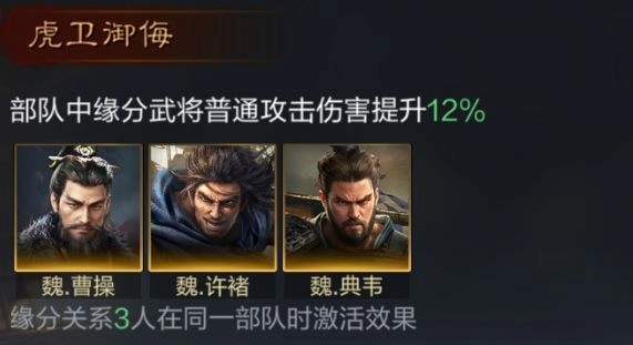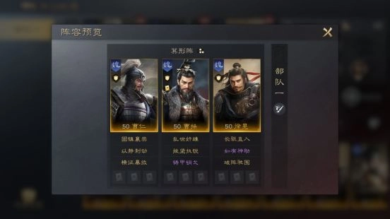 曹操能为全队提供减伤效果,还可对曹仁进行治疗,大幅提升部队的生存能力。曹仁不仅能确保自身的坦度,还能给敌方施加控制状态。徐晃兼具输出与控制能力,与曹仁配合能使对方难以进行有效输出。