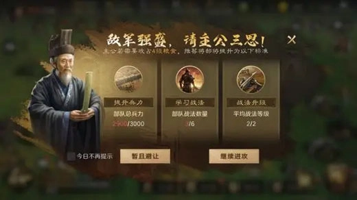 当各位玩家在开垦内城土地与城外领地的过程中,若碰到无法战胜对手的状况,或是自身部队的实力有所欠缺,系统便会给出需要提升部队战斗力的提示。
