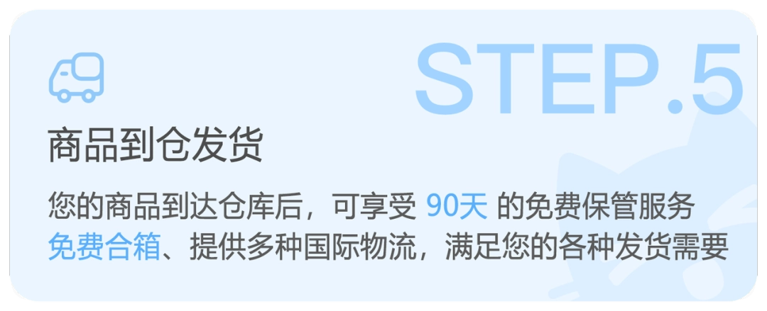 当您的商品抵达仓库后,能享有90天的免费仓储服务、免费合箱服务,还提供多种国际物流选项,可满足您的各类发货需求。