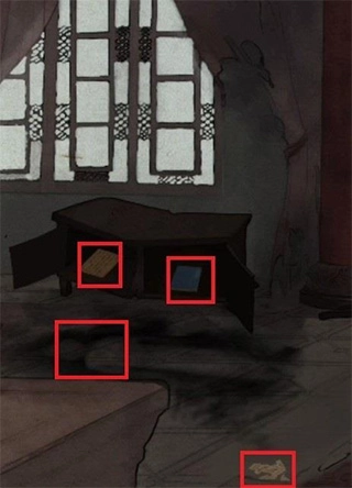 进入房间后,能在房间各处找到三份文件。点击地上的烧焦痕迹可获取线索,接下来要针对丁妙妙的态度展开操作,按照图示将线索放置上去。